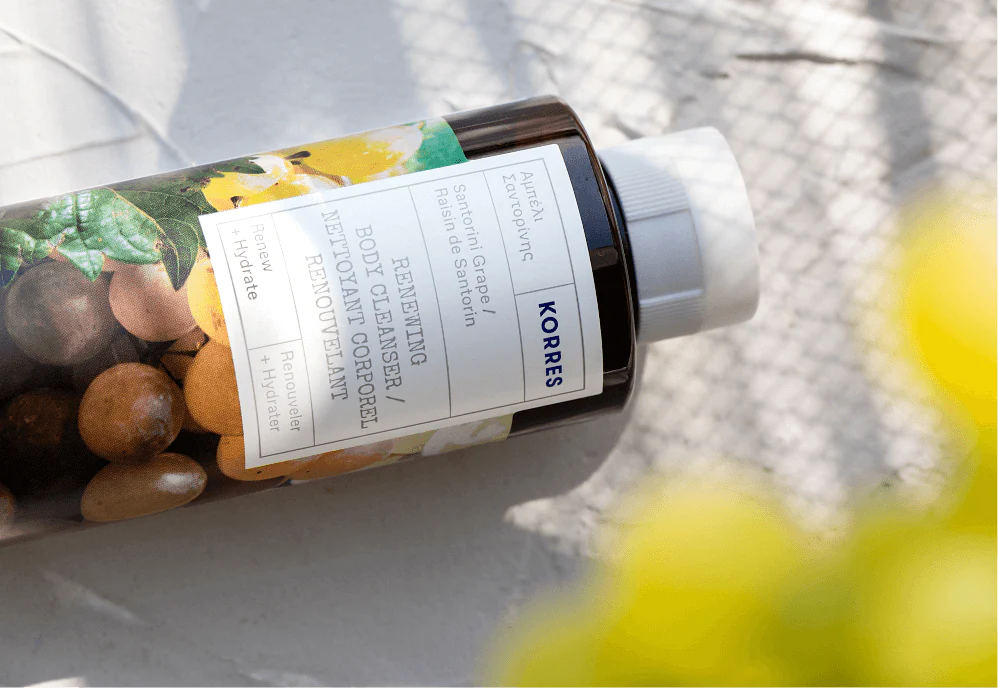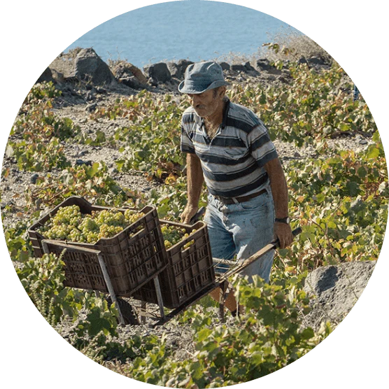 The Santorini Grape cultivation is unique in the world; close to the ground in the shape of a basket, protecting the grapes inside against winds and sunlight, while locking-in the essential sea mist water. We source the by-products of the cultivation from the Union of Santorini Cooperatives -the marcs. It is the first time that the great volume of winemaking by-products, instead of being discarded, is used to produce a cosmetic extract.